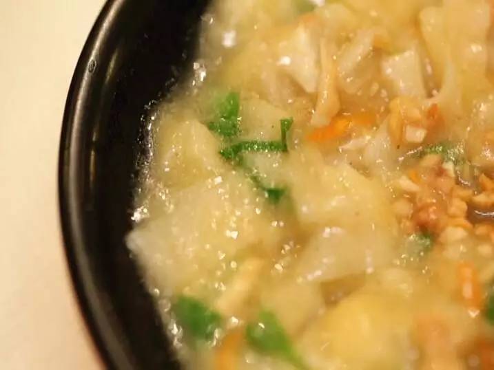 用勺子一攪就感受到了那黏糊勁兒,入口糊涂的香氣就散開了。面條已經(jīng)被煮斷,但吃起來(lái)還有筋筋的感覺。軟軟的胡蘿卜絲和油炸豆腐絲、還有脆爽的青菜段和面面的黃豆,混在一起滾燙咸香,滋味很足。微辣的蒜油也添了幾分香氣,很有家的味道。
