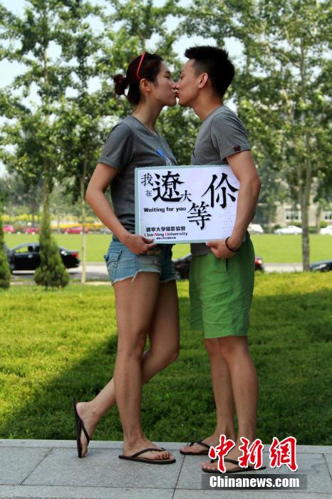 6月23日,情侶拿著“我在遼大等你!的牌子在拍照。當日,遼寧大學攝影協(xié)會推出一組遼大創(chuàng)意“招生名片”的圖片,數位帥哥靚妹抓人眼球。中新社發(fā) 于海洋 攝