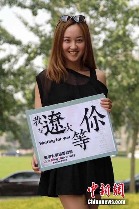 6月23日,一位女生拿著“我在遼大等你!”的牌子拍照。當日,遼寧大學攝影協(xié)會推出一組遼大創(chuàng)意“招生名片”的圖片,數位帥哥靚妹抓人眼球。中新社發(fā) 于海洋 攝
