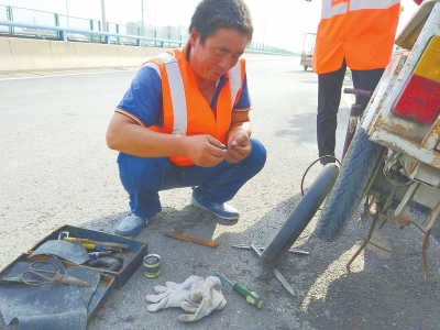 6日臨近中午,在中原路南水北調(diào)大橋附近,一位身穿環(huán)衛(wèi)工服裝的男子,正在路邊修補一輛電動三輪輪胎。只見他,技術(shù)嫻熟,從扒胎到補好胎安裝到位充氣,用時不到20分鐘。三輪車輪胎修補好,對方騎車離去,他則收好修車工具,又開始清掃馬路上的垃圾。