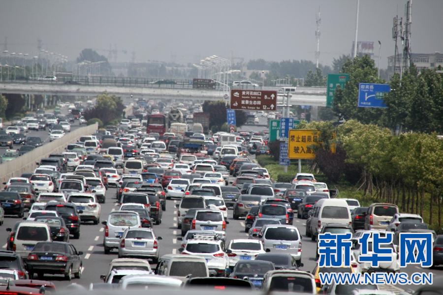 6月9日,端午小長(zhǎng)假首日,大批車輛在鄭州柳林高速入口處排隊(duì)等候。兩只小狗在被堵車中無(wú)奈向外張望。 新華網(wǎng)發(fā)(馮磊 攝)