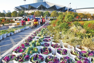 “嘿,快看,真美!感覺好像瞬間穿越到了絢麗多彩的春季!”昨日中午,在鄭東新區(qū)CBD商務(wù)內(nèi)環(huán),幾名市民指著花壇內(nèi)一大片黃、紅、紫三色相間的鮮花說。在這里,記者看到一撥撥工作人員正忙著將一盆盆鮮花擺放到預(yù)先設(shè)置好的花架上。姿態(tài)秀逸、枝葉扶蘇,綴滿鮮艷奪目紅果的南天竹十分吸睛;各種色彩亮麗的花朵,則為冬日的鄭州增添了一抹迷人的色彩;株形如牡丹,葉片形態(tài)美觀多變,觀賞性不輸鮮花的甘藍更是隨處可見。